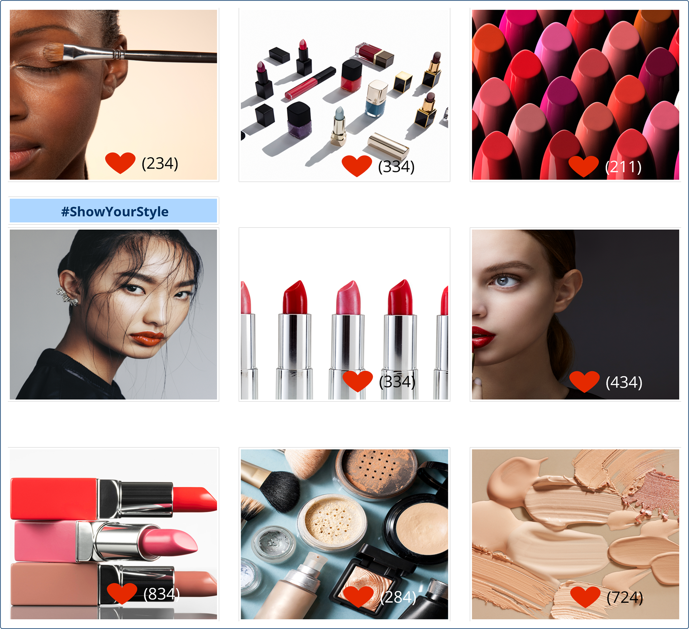 Illusztráció: UGC Galéria - Felhasználók által generált tartalom showcase szekció, amely valós vásárlói fotókat jelenít meg social proof metrikákkal. A rácsos elrendezés Instagram-szerű, ismerős böngészési élményt nyújt. Különösen hatékony lifestyle és vizuálisan vonzó termékeknél, ahol a használati kontextus bemutatása kulcsfontosságú a vásárlási döntésben. Saját szerkesztés.