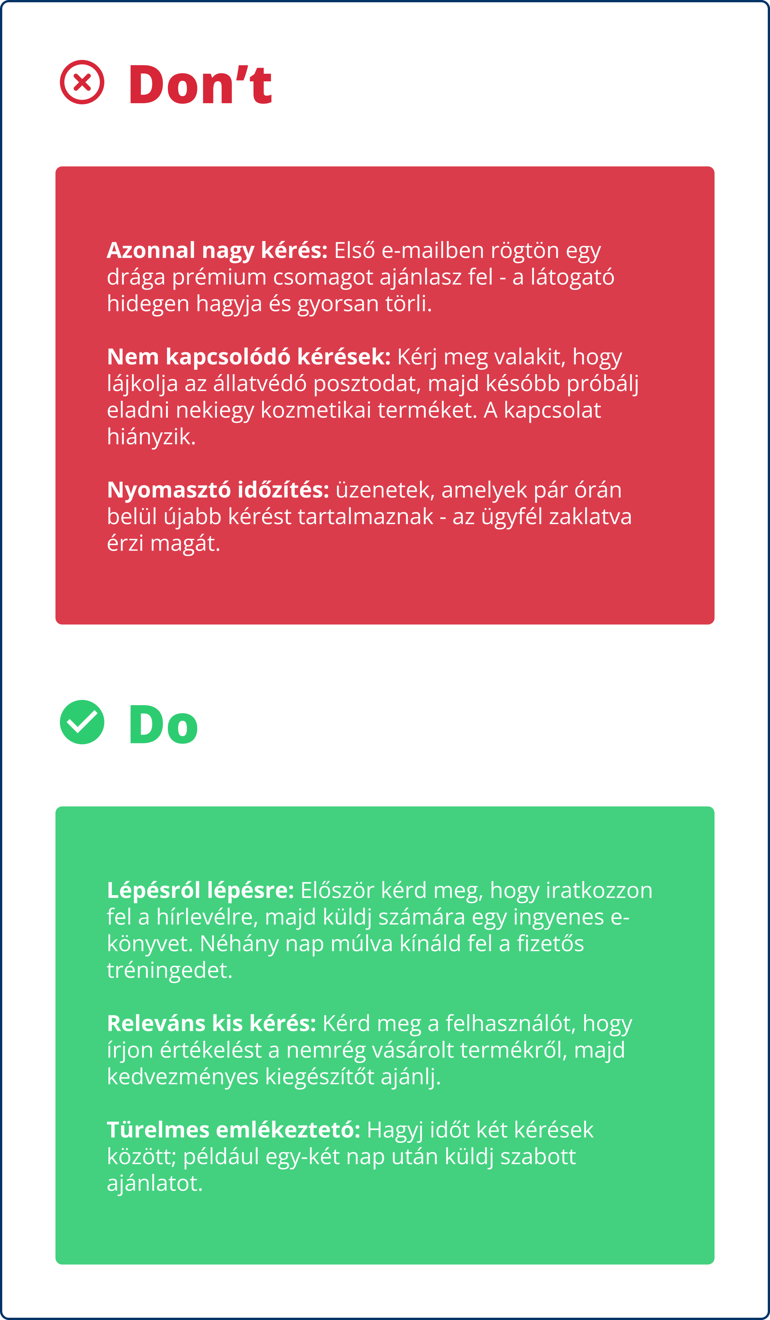 Kezdd egy apró kérdéssel. Kérd meg a látogatót, hogy iratkozzon fel a hírlevélre, töltse ki a kedvenc termékeiről szóló rövid kérdőívet, vagy ossza meg egy posztodat. Miután teljesítette, könnyebben mond igent a nagyobb ajánlatra (pl. fizetős termékre vagy előfizetésre).