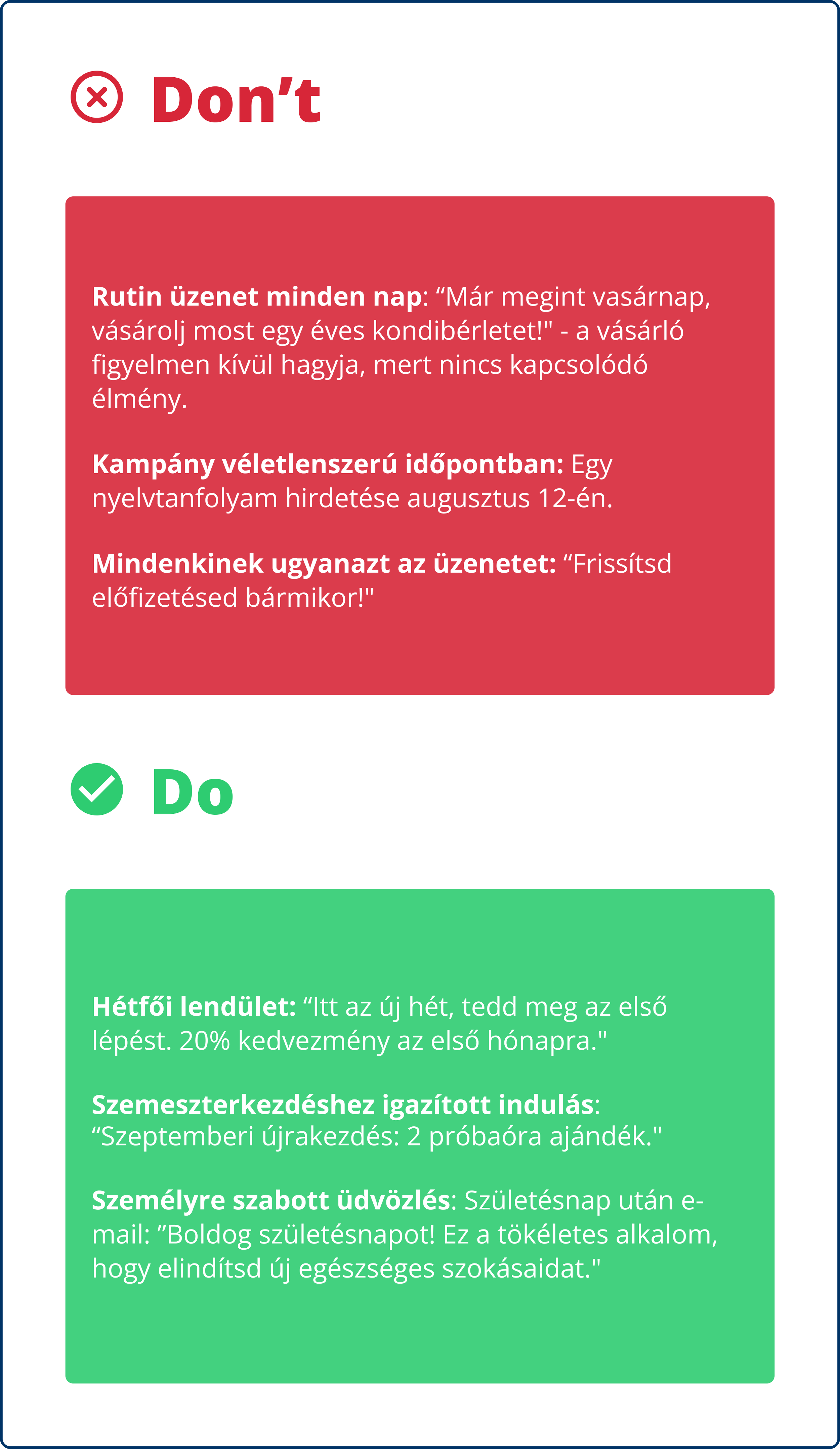 Időzíts kampányokat a mérföldkövekhez. Indíts akciókat hétfőn, hónap elején vagy januárban. Hangsúlyozd, hogy most itt az idő a váltásra.