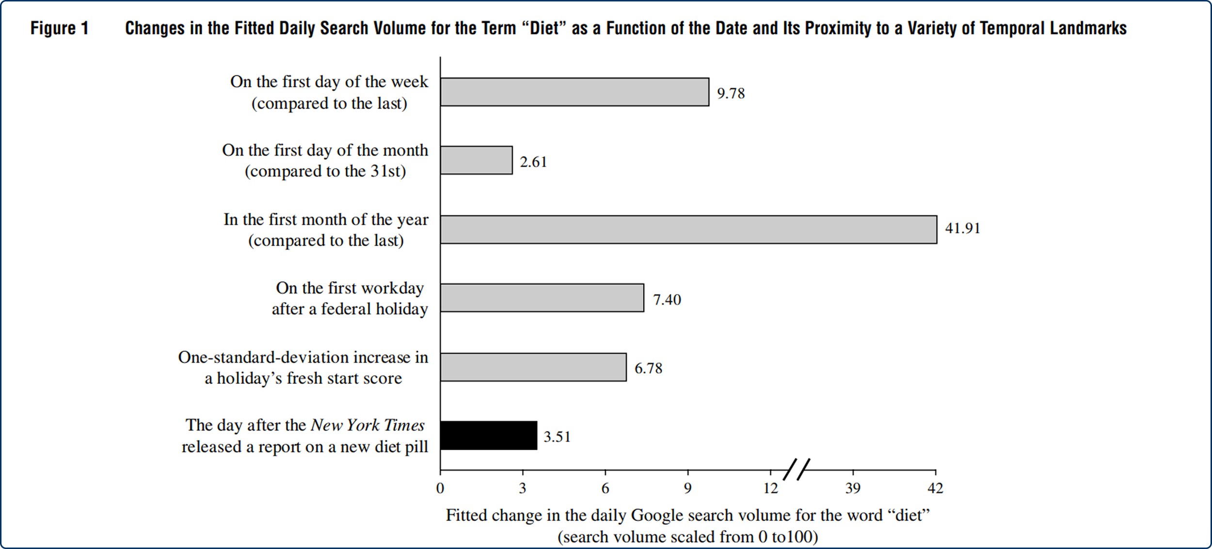 A Dai–Milkman–Riis tanulmány sorra vette a különböző időbeli mérföldköveket és azok hatását a fitneszterembe látogatásra: