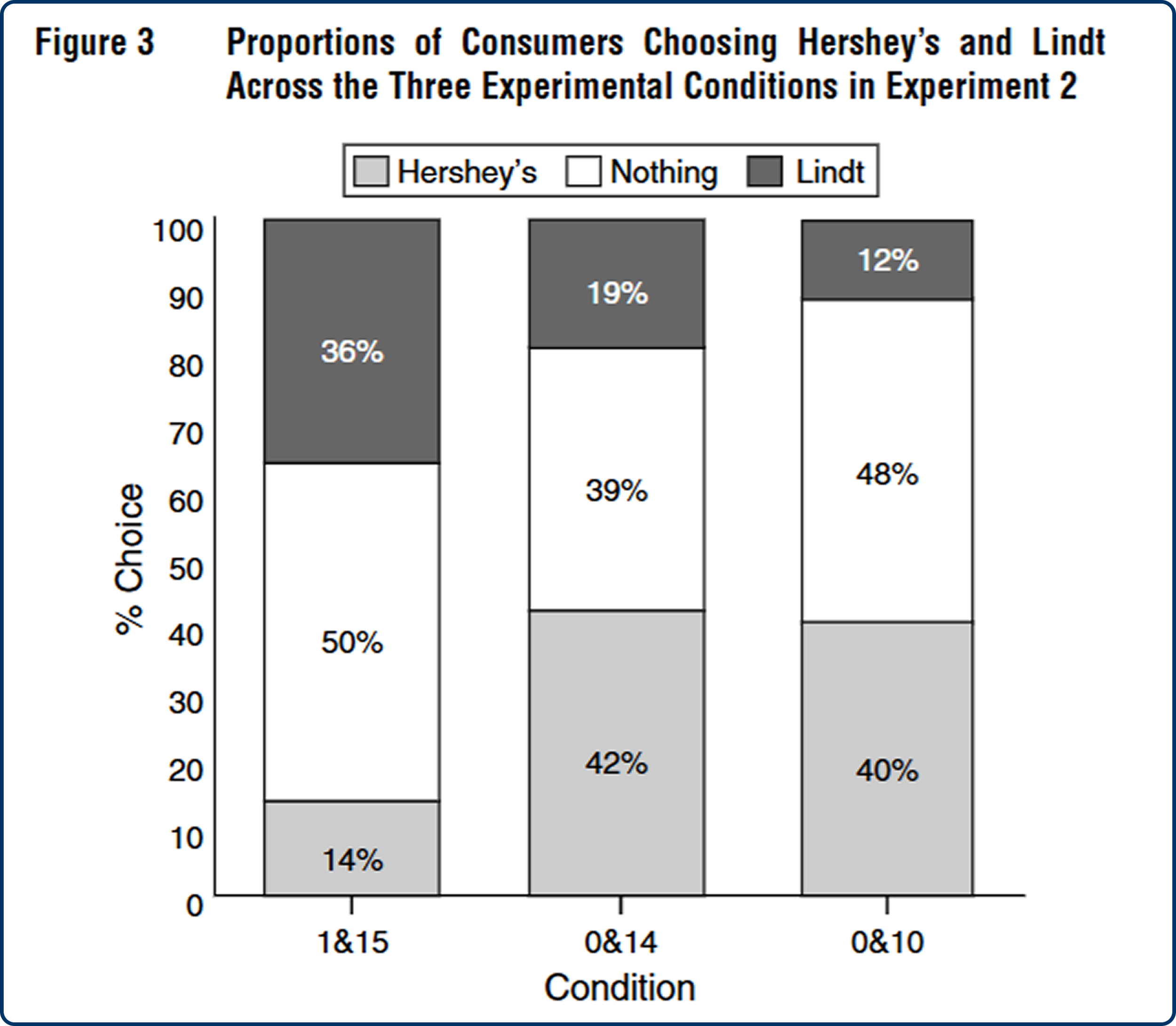 A zero price effect lényege, amikor az egyik opció ára nulla, az emberek szinte irracionális módon vonzódnak hozzá, és drasztikusan megváltozik a választásuk. A Shampanier, Mazar és Ariely kísérletében két terméket kínáltak: egy olcsó (Hershey’s csoki) és egy prémium (Lindt praliné) csokoládét. Ha a kis csoki 1 centbe, a prémium pedig 15 centbe került, a résztvevők 28 %-a választotta a kicsit és 72 %-a a drágábbat. Amikor azonban a kis csoki ingyen volt, míg a praliné ára csak 1 centtel csökkent (14 cent), az olcsó csoki választási aránya 92 %-ra ugrott, a drágábbé pedig 8 %-ra esett.