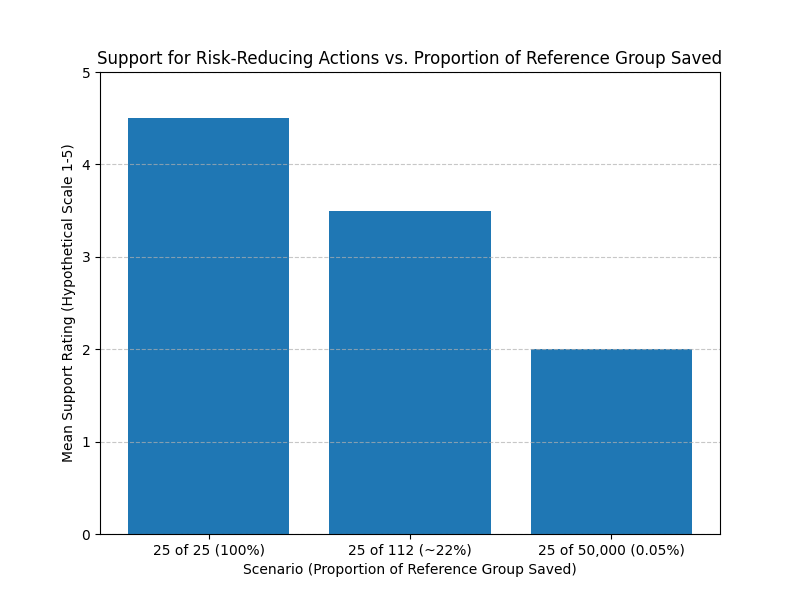 Arányérzék: Az emberek ösztönösen a megmentett életek arányát figyelik, nem az abszolút számot. Ha egy beavatkozás a veszélyeztetett csoport nagy részét menti meg (pl. 25/25), az sokkal vonzóbb, mint ugyanennyi élet megmentése egy hatalmas csoportban.