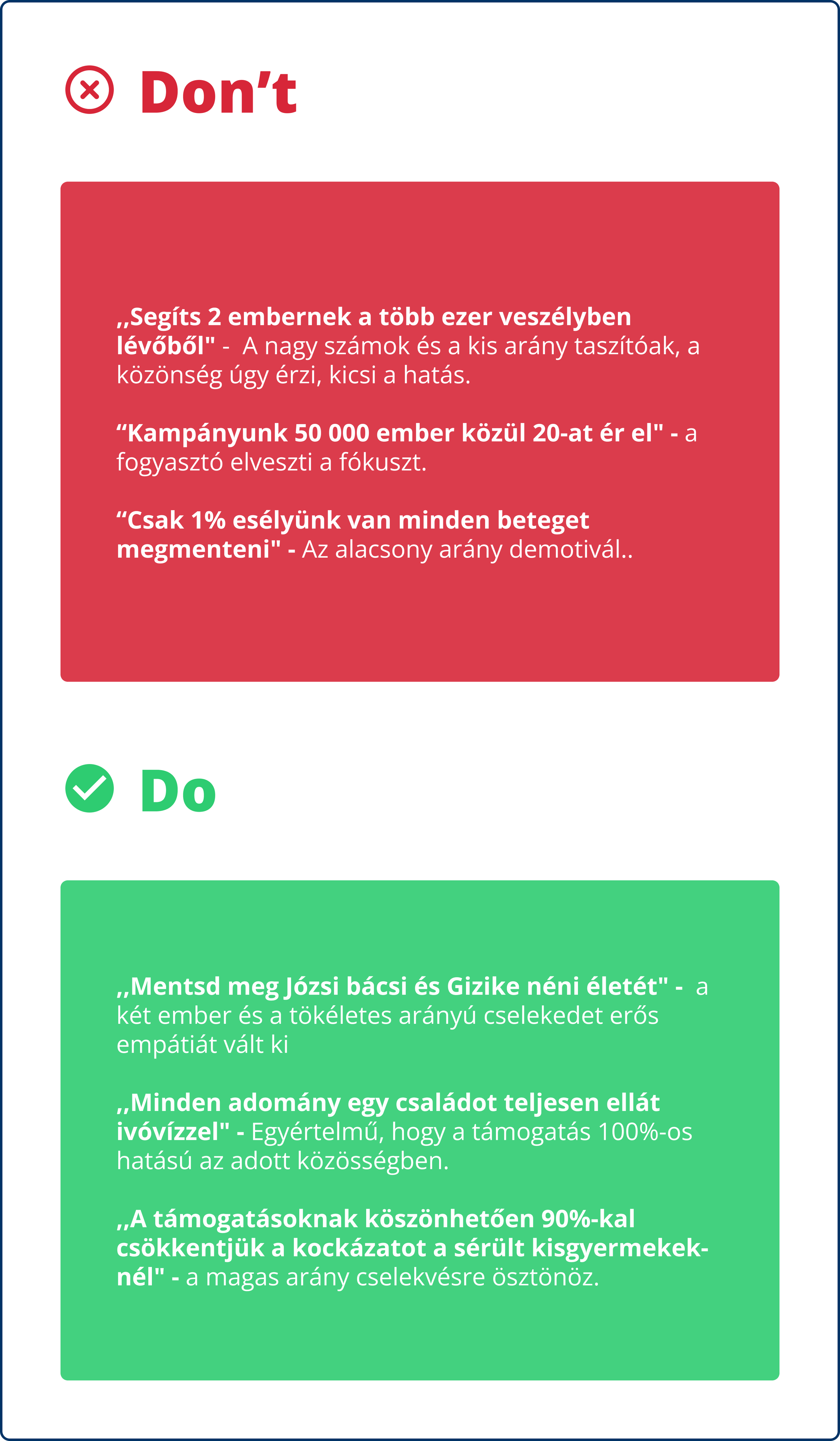 Kiemeld a megmenthető hányadot: Kampányaidban ne csak a megmentendők számát említsd, hanem azt is, hogy ez a csoport mekkora részét jelenti (pl. „10 gyermekből 9-nek segítesz”).