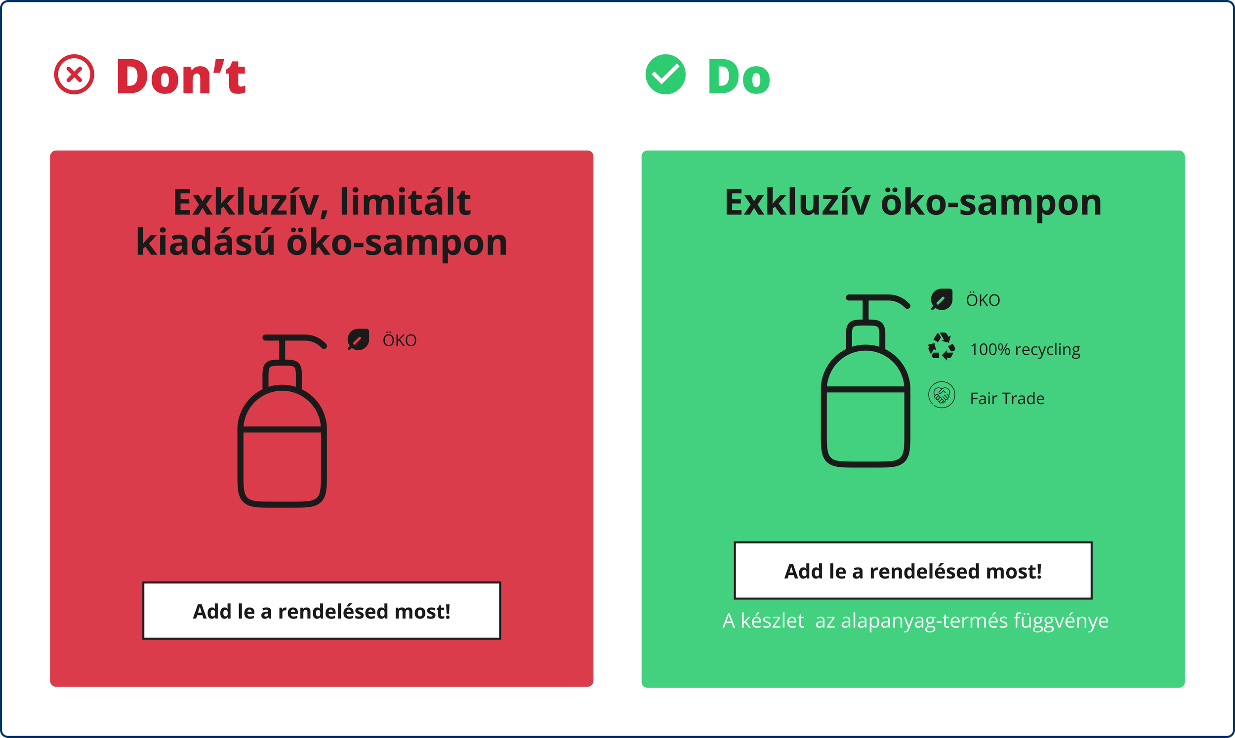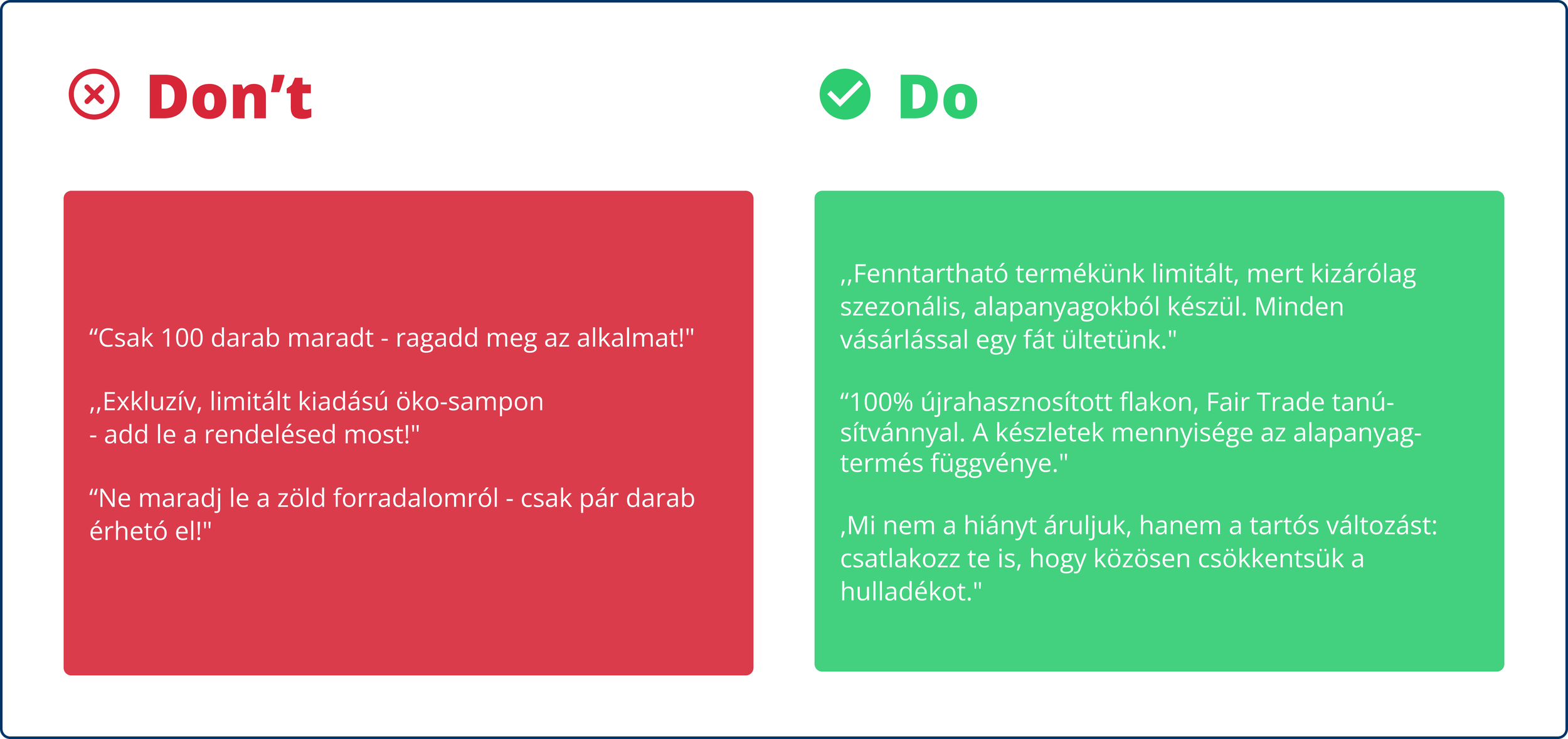Ne játszd meg a hiányt. Ha valóban limitált egy termék (pl. szezonális vagy egyedi erőforrásból készül), magyarázd el, miért. Az öncélú „csak néhány maradt!” szöveg zöld termékeknél ellenérzést kelt.