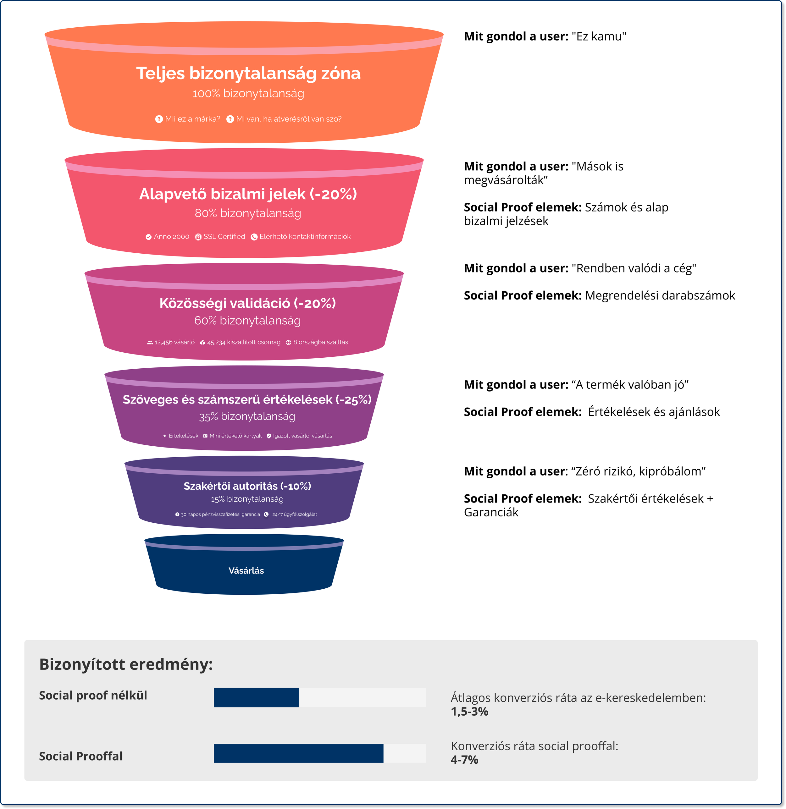 Ha a termékoldalon megszületett a döntés csírája, a fizetési folyamat (checkout) során dől el, hogy a látogató vásárlóvá válik-e. Sajnos ez a tölcsér legkritikusabb pontja: a kosárelhagyási arány gyakran 70% körüli. Itt a social proof szerepe már nem annyira a meggyőzés, mint inkább a bizonytalanság eloszlatása és a végső megerősítés. A felhasználó fejében ilyenkor tipikusan ezek a kérdések kavarognak: „Biztonságban megadhatom a kártyaadataimat?”, „Biztos jó döntést hozok ezzel a termékkel?”, „Mi van, ha mégsem tetszik majd?”. Segítsünk neki megnyugodni és befejezni a vásárlást!